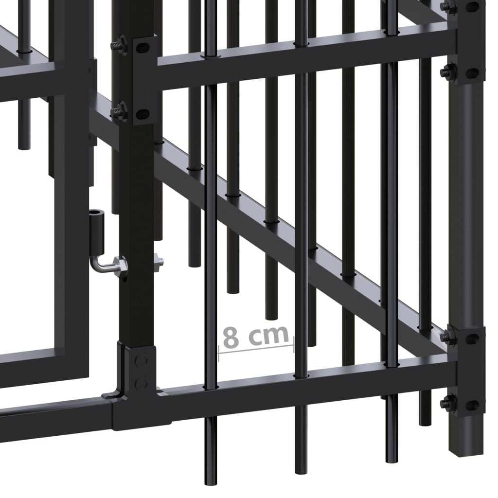 This dog kennel provides ample exercise space. The walls of steel bars help prevent mischief and unexpected accidents while enabling ventilation. Thanks to the sturdy powder-coated steel construction, this dog kennel is durable and built to last. The roof provides protection from sun, rain, snow, as well as other weather conditions. The hinged door with a lockable latch system ensures extra security and safety for your dogs.Color: BlackMaterial: Powder-coated steelOverall dimensions: 116.1" x 78.7" x 89.8" (L x W x H)Door size: 19.7" x 70.9" (W x H)With doors and roofLockable latch systemAssembly required: Yes